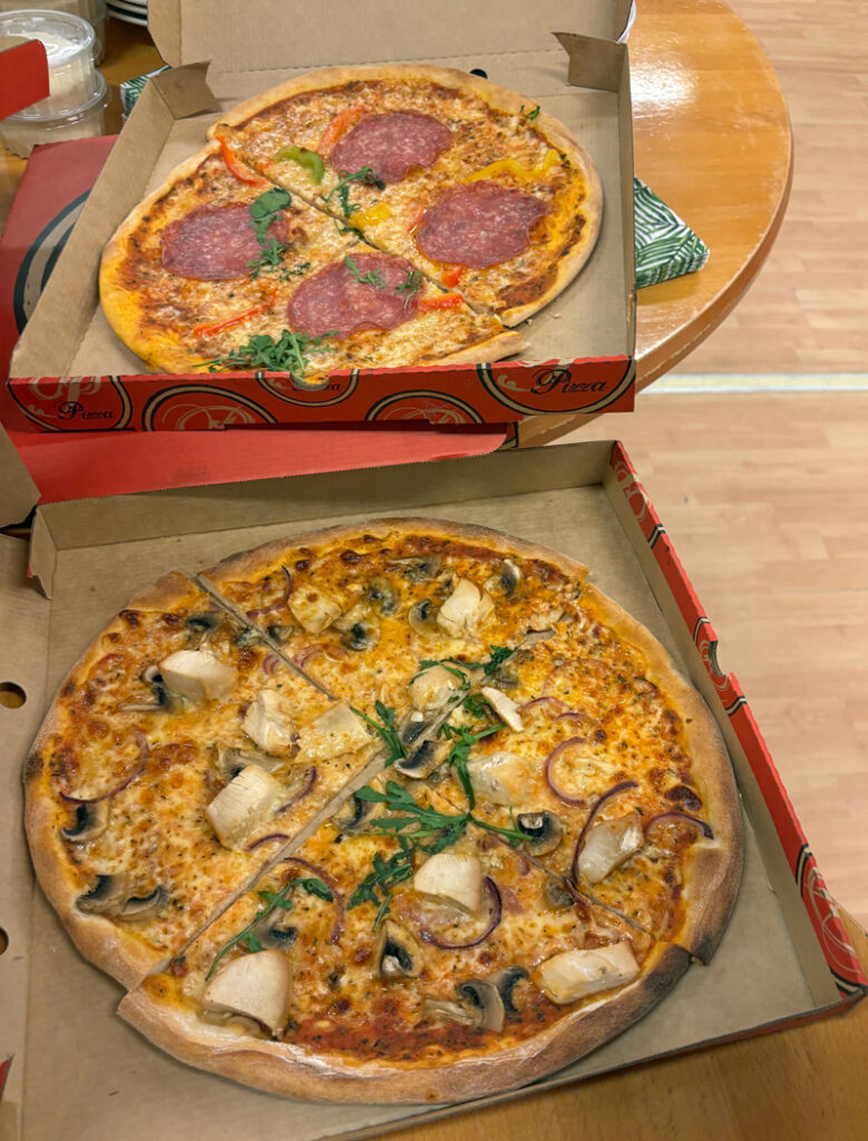 Det bjöds på 3 olika pizzor, salami, kyckling och oxfilé