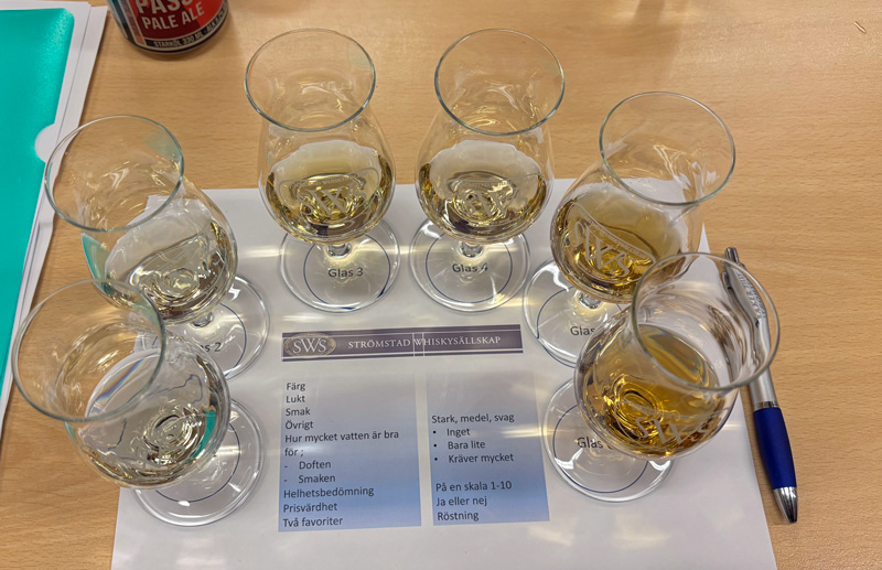 Det var denna gång ett startfält med sex olika whisky från destillerier i Skottland. Då det var flera nya deltagare så gick Martin genom hur man kan prova whisky med färg, doft och smak innan provningen startade.
